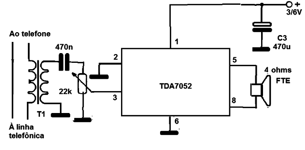 Al igual que el circuito anterior, este se utiliza en la parte analógica de las líneas telefónicas. El mismo circuito puede ser utilizado con otros zócalos o directamente acoplado en serie con la línea. T1 está formado por arrollamiento de 50 vueltas de alambre 28 en una varilla de ferrita, lo que resulta en los terminales 1 y 2, y de 200 a1000 vueltas de alambre fino (32) para el bobinado 3 y 4. El circuito puede ser alimentado por dos o cuatro baterías y P1 ajusta el volumen al mejor calidad de sonido sin distorsiones. También se puede utilizar un pequeño transformador de potencia y el devanado de baja tensión conectado a los puntos 1 y 2.