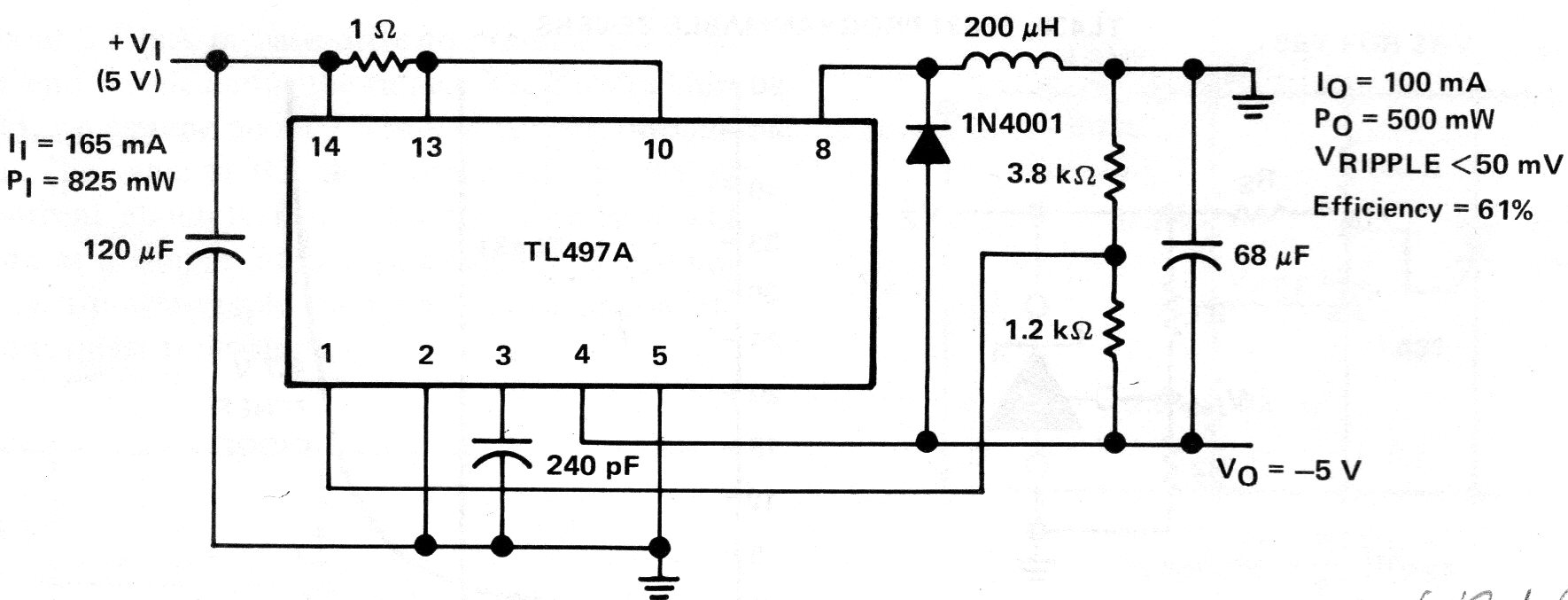 Este circuito proporciona un voltaje negativo de -5 V con una corriente de hasta 100 mA. Texas Instruments sugiere el circuito en uno de sus manuales. La tensión de ondulación es de solo 50 mV como máximo. En el propio diagrama se dan más características.
