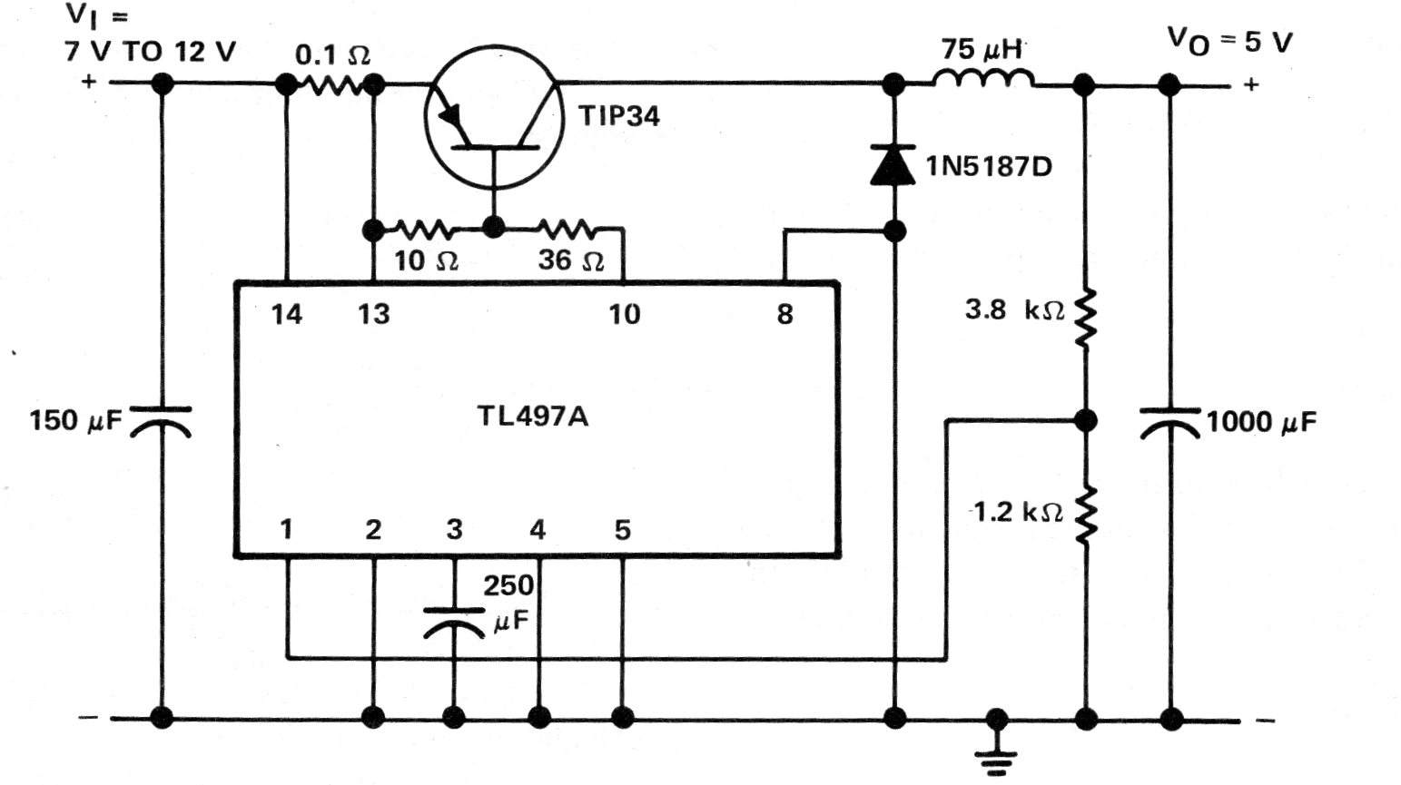 La entrada de este regulador puede estar entre 7 y 12 V y la salida es de 5 V. El circuito es del manual de aplicaciones lineales de Texas Instruments 1996. El transistor debe montarse en un buen radiador de calor.
