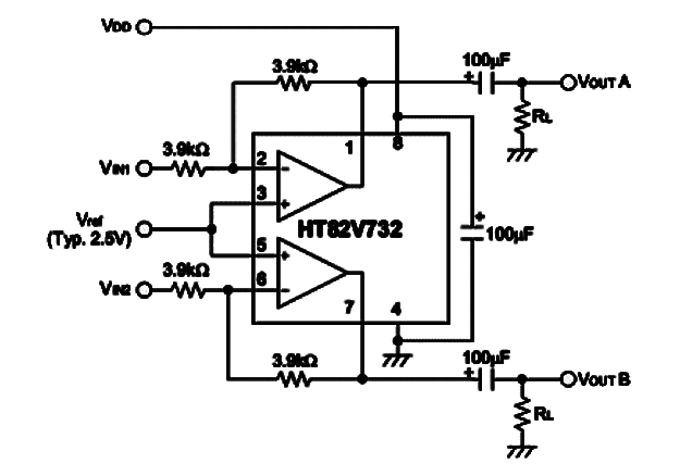 En la Figura tenemos un amplificador de audio diseñado para aplicaciones portátiles, tanto en mono como versión estéreo (BTL). El diagrama que se muestra es para la versión estéreo, pero la documentación original que hace Holtek HT82V732, el circuito integrado utilizado en el proyecto se puede encontrar la aplicación en puente. El circuito integrado se proporciona en la cubierta SOP de 8 pines. El rango de reproducción es de 20 kHz y la ganancia sin retroalimentación es de 70 dB. En la figura tenemos también el pinout del IC utilizado. Compruebe la disponibilidad de componentes antes de salir para el montaje