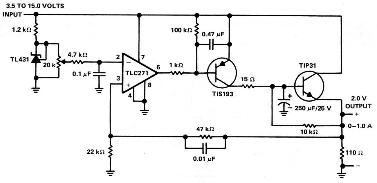 Esta fuente de alimentación se encontró en el Manual de aplicaciones lineales de Texas Instruments de 1996. El circuito usa un operacional para establecer la referencia y dos transistores. El transistor de potencia principal debe montarse en un disipador de calor.