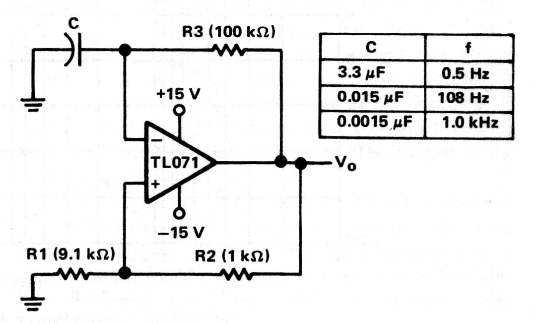 Este circuito fue sugerido por Texas Instruments en un manual de amplificadores operacionales. Se pueden utilizar otros operacionales y la fuente de alimentación debe ser simétrica con tensiones de 6 a 15 V dependiendo de la operación utilizada. La tabla proporciona los valores de los capacitores para diferentes frecuencias.