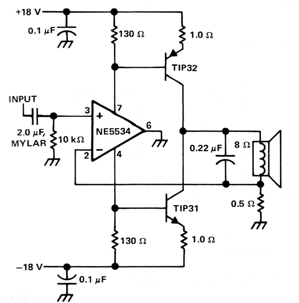 Este amplificador fue sugerido por el manual de aplicaciones lineales de Texas Instruments de los años 90. Aunque el circuito integrado no es muy común, se pueden probar equivalentes y los transistores de salida deben estar equipados con disipadores de calor.