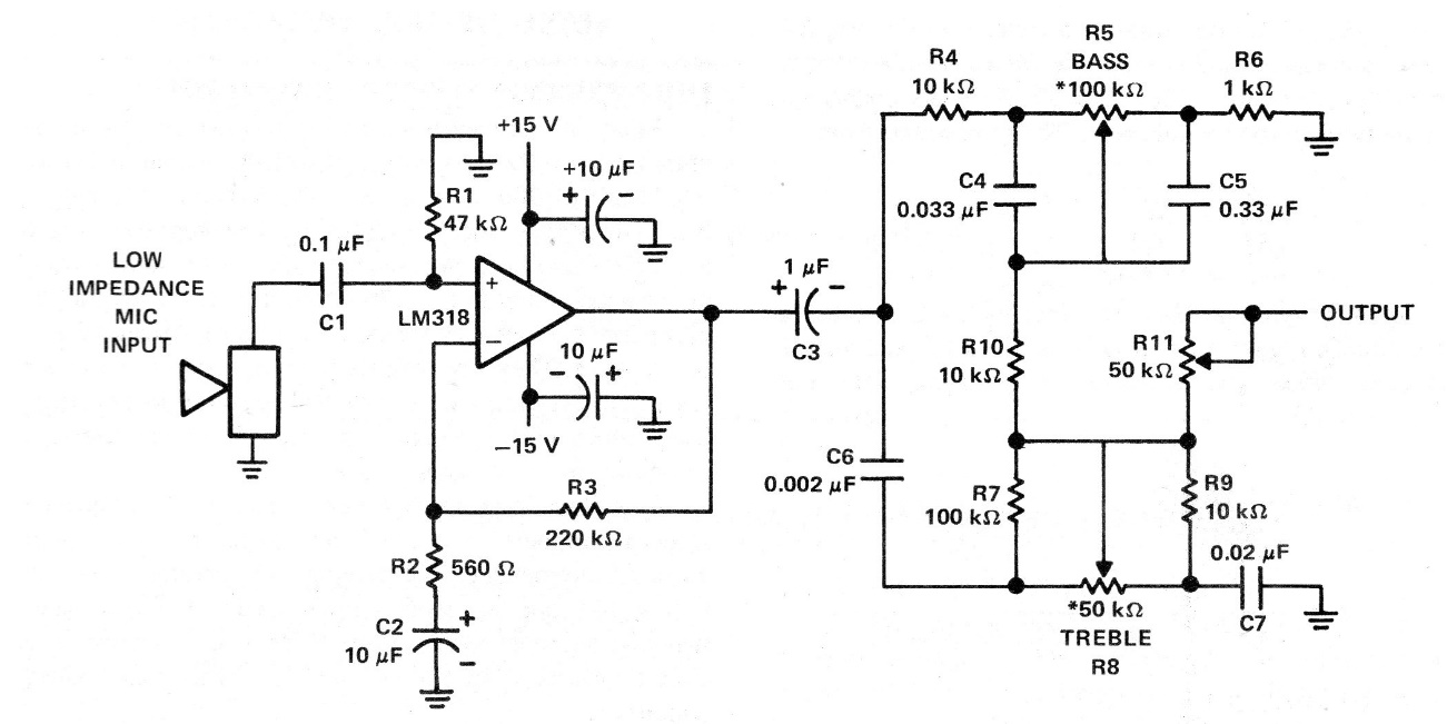 Encontramos este circuito en una publicación técnica de Texas Instruments de 1996. Sin embargo, el circuito todavía es actual y se pueden usar amplificadores operacionales equivalentes. La fuente es simétrica y el circuito tiene una ganancia cercana a los 18 dB.