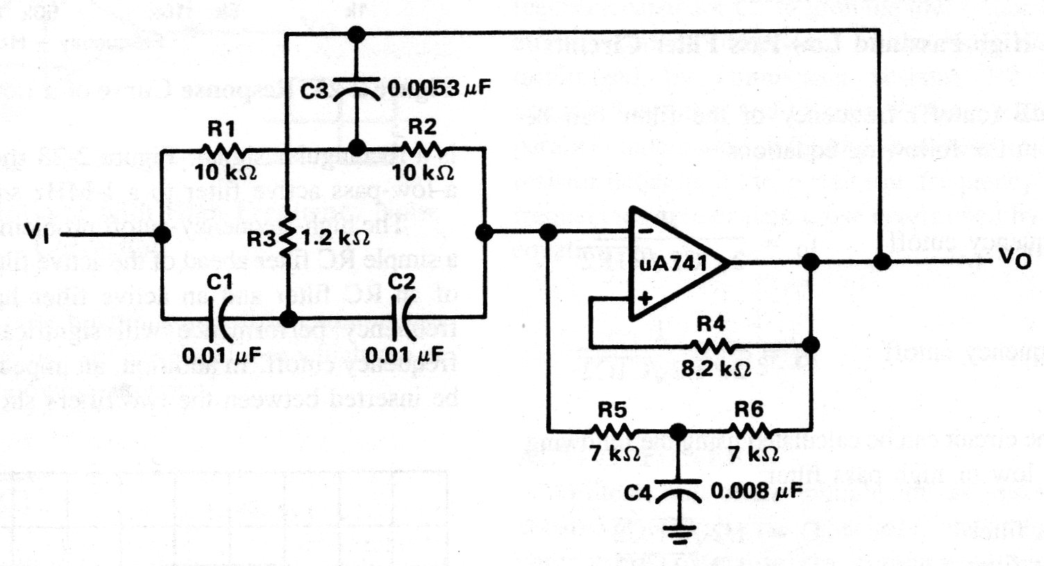 Este filtro se encontró en un manual de Texas Instruments basado en un amplificador operacional 741. Se pueden usar otros operacionales y, con los componentes indicados, la frecuencia de rechazo es de 2 kHz.