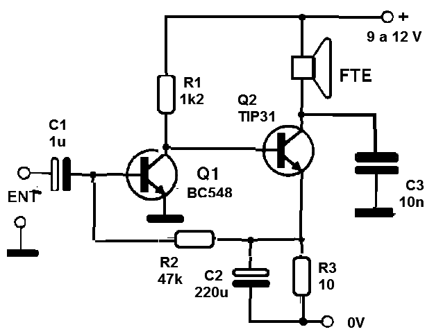 El propósito de este circuito es proporcionar unos pocos vatios de potencia para un altavoz pesado con buena calidad de sonido, que actúa como paso de refuerzo de sonido paso para portátiles y otras aplicaciones. Q2 debe estar provista do radiador de calor y la fuente de alimentación debe tener por lo menos 500 mA de corriente. Una aplicación es multimedia, reforzador de sonido a MP3 usando cajas, intercomunicadores y receptores experimentales. La fuente debe tener excelente filtrado y los cables de entrada deben estar blindados.