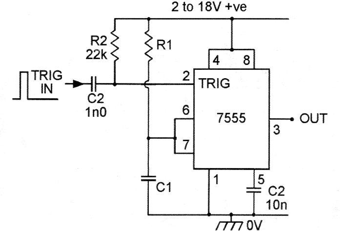 En la figura tenemos la forma de disparar un monoestable CMOS 7555 con pulso positivo. El tiempo que la salida permanece en el nivel alto depende de la constante de tiempo del circuito R1 C1. La alimentación se puede realizar con tensión de 2 a 18 V. El circuito se puede utilizar como shield.