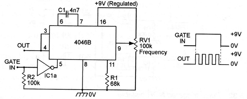 Este circuito produce un tren de pulsos controlado por la salida de un circuito lógico o un microcontrolador. Lo encontramos en una documentación de 1996 y su alimentación debe realizarse con 5 V para su aplicación como shield. Para otras aplicaciones, la alimentación puede estar entre 3 y 12 V. La frecuencia del tren de pulsos depende del capacitor.