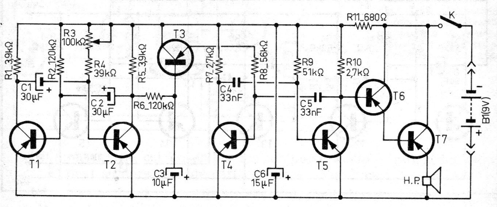 Los transistores de baja potencia de esta sirena pueden ser BC548 o BC558 según NPN o PNP. El transistor de potencia de salida puede ser el TIP42 con disipador de calor. El circuito es de documentación francesa de la década de 1980 y el potenciómetro ajusta la intermitencia del efecto de sonido. E