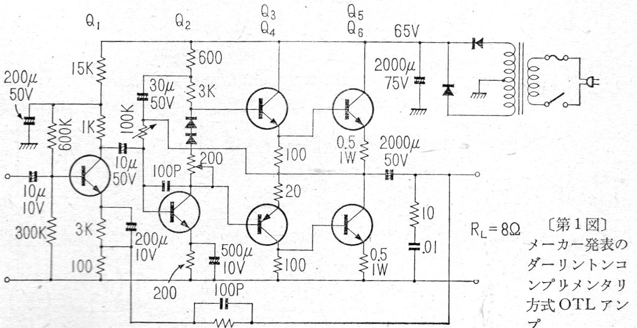 Este circuito de una publicación japonesa de 1968 utiliza transistores de germanio de la época como el AD135 que deben montarse en disipadores de calor. La potencia es de unos pocos vatios y no se dan muchos detalles de su construcción.
