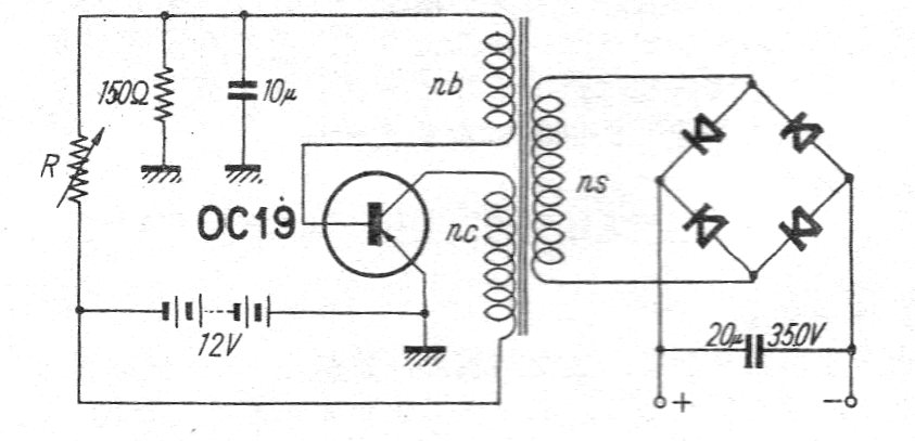 Este circuito es de una revista japonesa de 1957, que muestra el uso de OC19 en un inversor de alta tensión. El transistor común en ese momento debe estar equipado con un disipador de calor y la tensión obtenida depende del transformador utilizado.