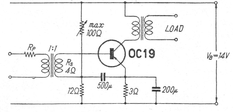 Este paso de potencia es de una documentación de 1957, una época en la que el transistor utilizado era común para obtener unos watts de buen audio. El transformador tiene un primario de 100 a 200 ohms y el transistor debe tener un disipador de calor.