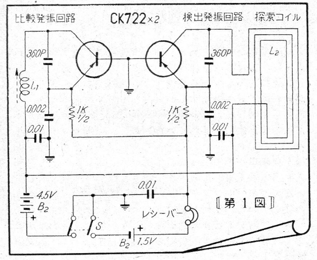 En este circuito de una publicación de 1956, el teléfono debe ser magnético de alta impedancia y L1 tiene de 200 a 300 vueltas de cable 32 en una varilla de ferrita. La bobina exploradora consta de 10 a 12 vueltas de alambre 28 en forma de plástico de unos 15 cm de diámetro. La alimentación es proporcionada por baterías. Las bobinas deben ajustarse para obtener un batido cero.