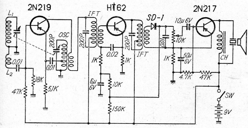 Este es un circuito de radio comercial de la década de 1960. El circuito fue encontrado en una publicación japonesa de 1960 y utiliza 3 transistores de germanio de la época. La escucha se realiza a través de un altavoz y funciona con pilas.