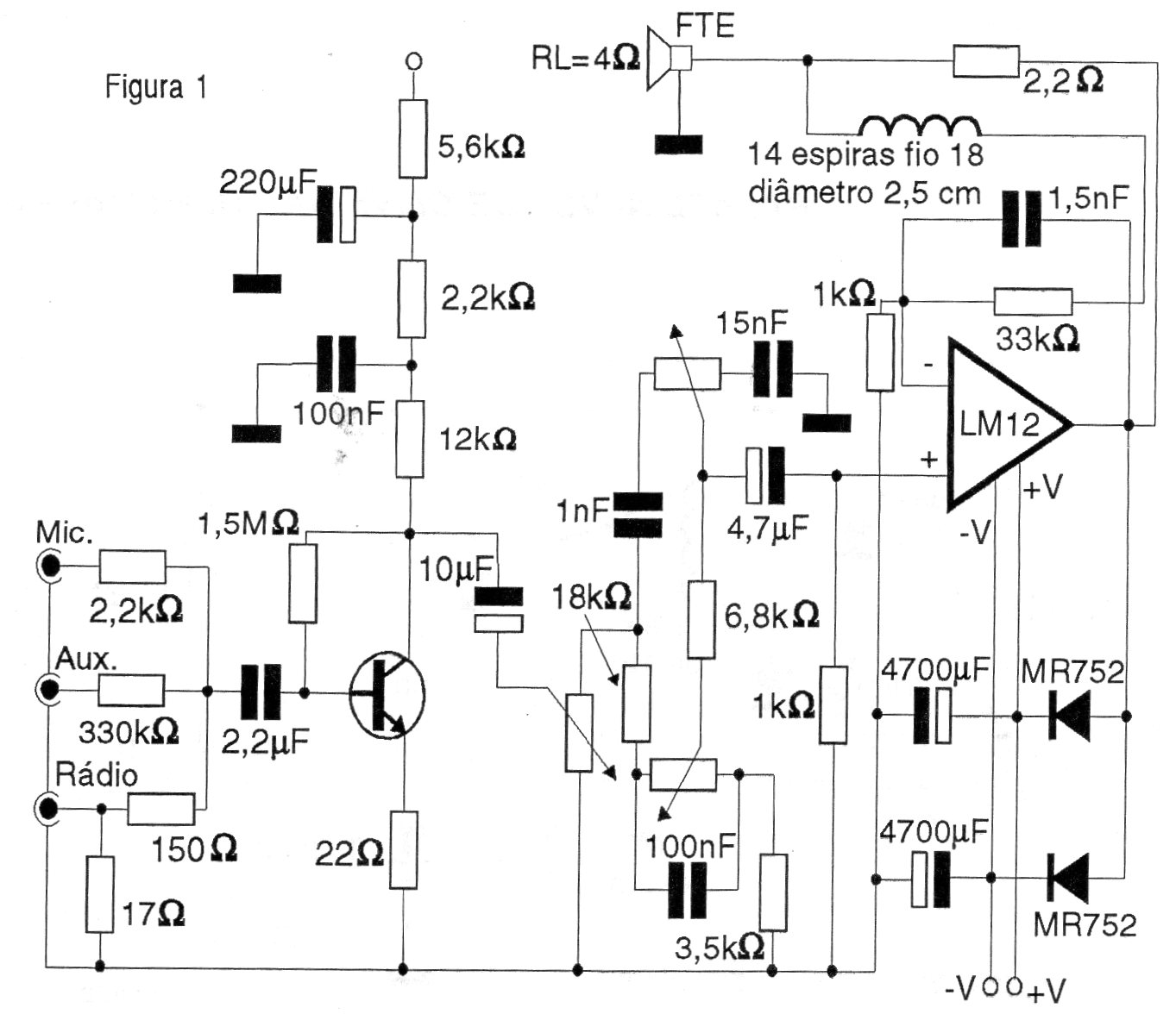 El componente crítico de este proyecto que se encuentra en una publicación de 1993 es el circuito integrado LM12. Este componente debe montarse en un excelente disipador de calor. Se proporciona la fuente de alimentación y en el trazado se debe tener cuidado con los senderos de alta corriente que deben ser muy anchos.