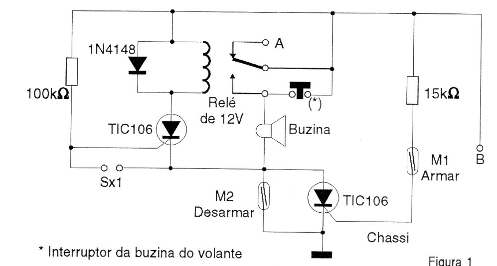 Este circuito simple utiliza pocos componentes comunes y se puede instalar en cualquier automóvil. En caso de activación por el sensor SX (normalmente cerrado), el relé se detiene al disparar la bocina. El relé debe tener una corriente de contacto alta, según la bocina.