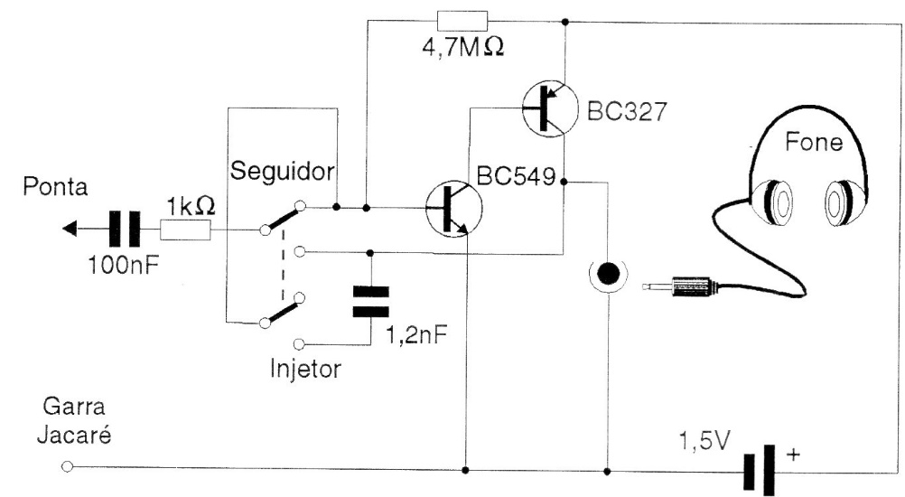 Este circuito de prueba ultra simple es de gran utilidad en cualquier banco de electrónica. La energía es suministrada por una batería y el teléfono debe ser magnético de alta impedancia. El circuito sigue solo señales de audio y el equivalente para BC327 puede ser BC557.