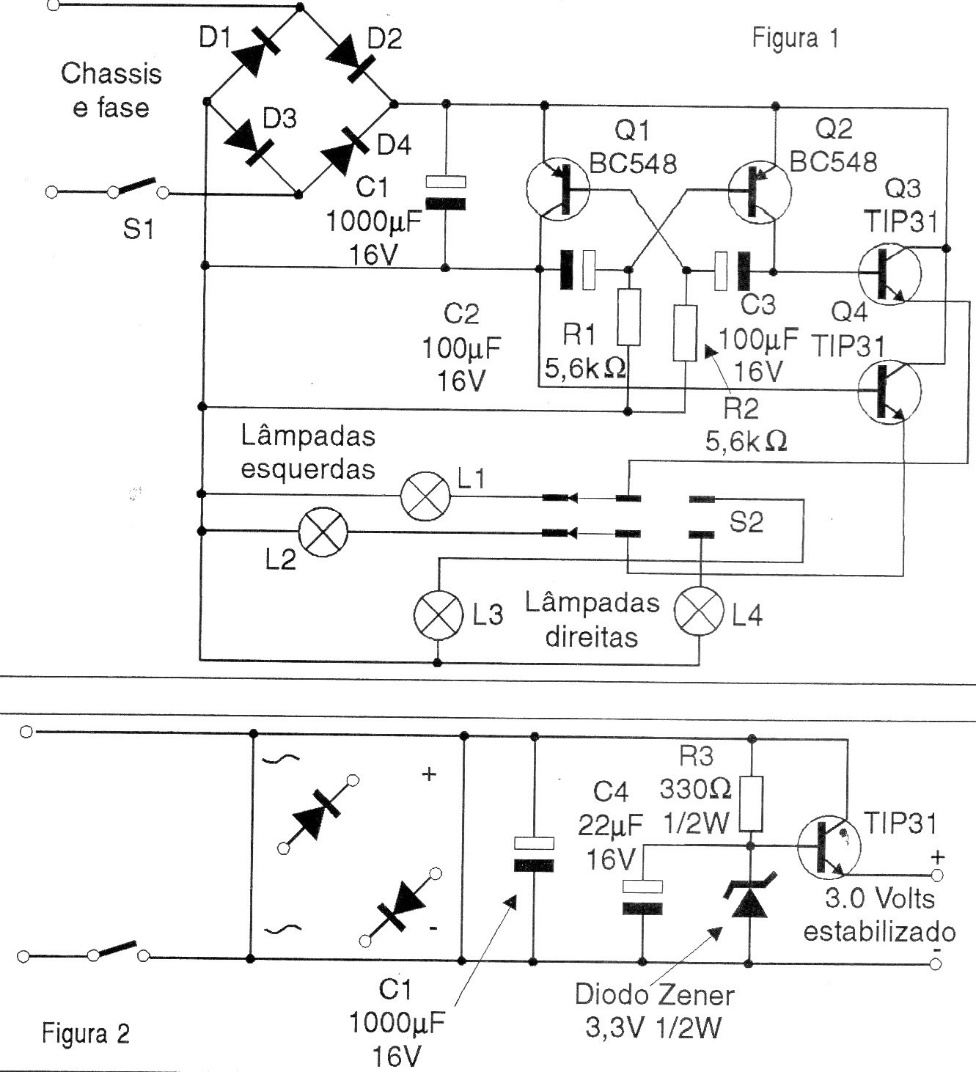 Este circuito es de una publicación antigua de los años 90, pero se puede adaptar para funcionar con LED. La frecuencia de los destellos depende de los capacitores C2 y C3 modificables.