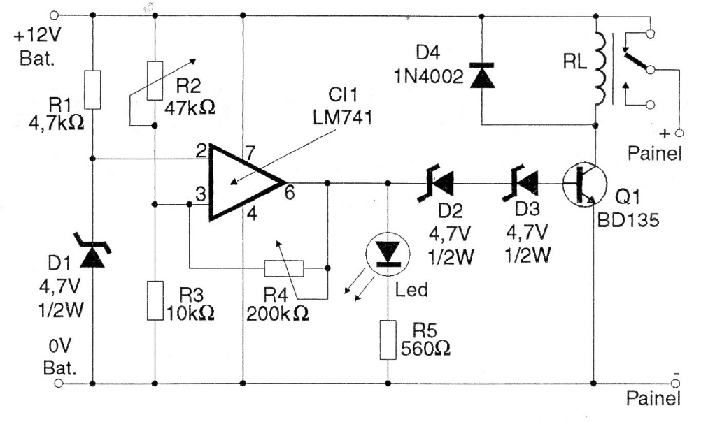 Este regulador tipo serie para cargar baterías a partir de paneles solares fue encontrado en una documentación técnica de los años 90. El circuito hace uso de componentes muy habituales aún hoy y tiene la capacidad de deshabilitar la carga cuando la tensión alcanza los 13,8 V. son 12 V de la batería.