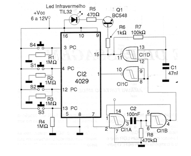 El receptor de este circuito es el CIR3616S. El sistema funciona con infrarrojos modulados y tiene 4 canales en esta versión. La alimentación se puede realizar con tensiones de 5 a 12 V. Con adaptaciones, el circuito se puede utilizar como shield transmisor para microcontroladores. Se pueden usar LED infrarrojos más potentes si en R5 se debe reducir.