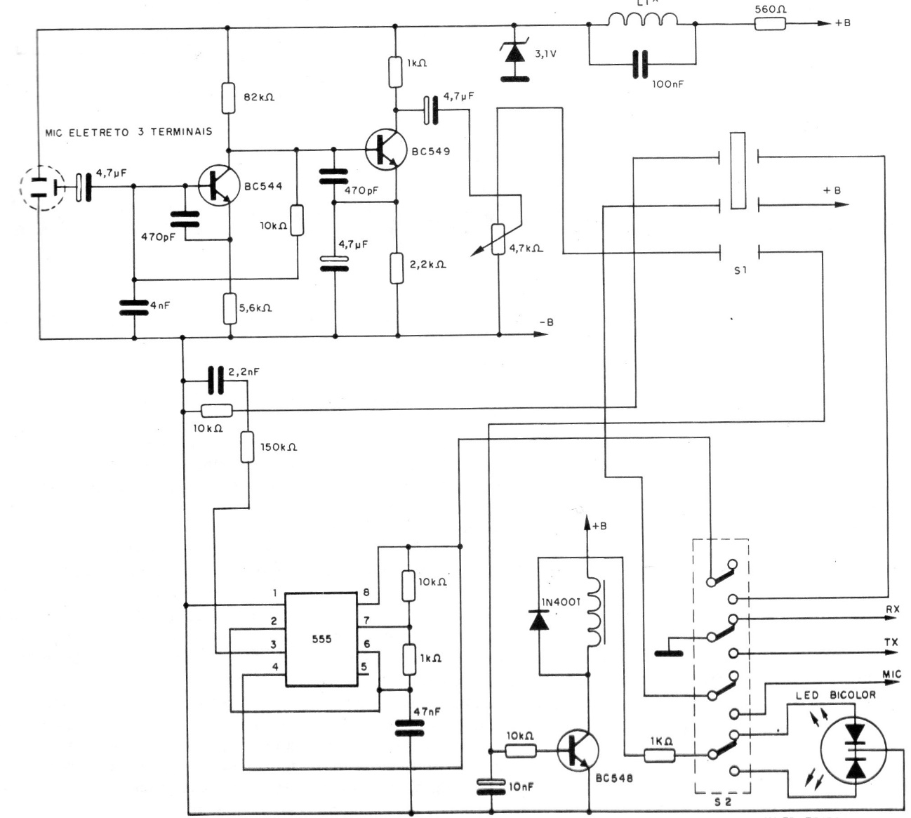 Este circuito para la gama PX o PY también incluye el efecto bip al cambiar. El circuito está alimentado por 12 V, que es la tensión del relé utilizado. El circuito se encontró en una publicación de 1993, pero los componentes utilizados siguen siendo actuales.