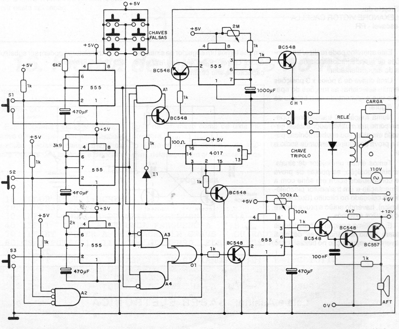 Este circuito fue encontrado en documentación de los años 90. Está basado en circuitos integrados CMOS y puede ser alimentado por tensiones de 5 a 12 V dependiendo del relé utilizado. En las figuras adicionales tenemos los circuitos de codificación y temporización.