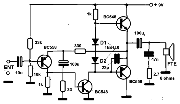 Encontrado este amplificador como parte de un artículo de una publicación de 1990. Con los cambios, todavía se puede construir con transistores más modernos. La potencia es de unas decenas de miliwatts y la calidad del sonido es buena para intercomunicadores y pequeños radios, auriculares, cajas multimedia o como un buen seguidor de señales. La fuente debe tener una excelente filtraje y lo cable de entrada debe ser blindado.