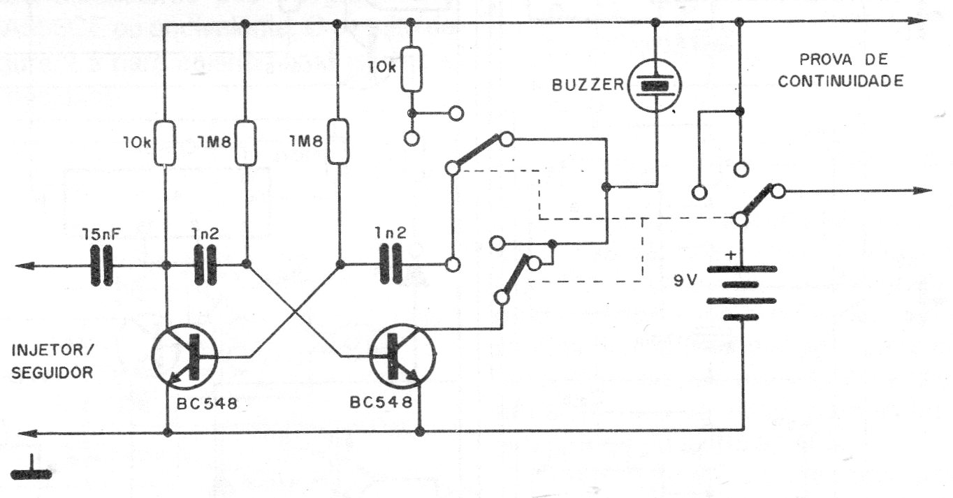 Este sencillo circuito, alimentado por 4 baterías o batería de 9 V, reúne varias funciones de gran utilidad en el taller de reparaciones y pruebas de electrónica. La señal rectangular generada tiene armónicos que abarcan un amplio rango de frecuencias, lo que permite realizar pruebas de audio y RF.
