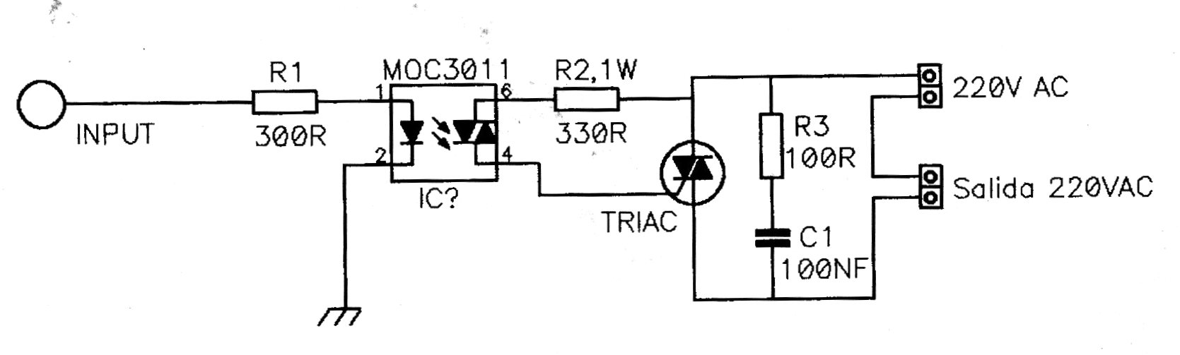 Este escudo aislado para triac se encontró en documentación europea antigua. El resistor R1, de hecho, puede tener valores entre 270 y 330 ohmios para microcontroladores con salidas de 5 V. El triac puede ser el TIC226 montado en un disipador, según la corriente de carga controlada.
