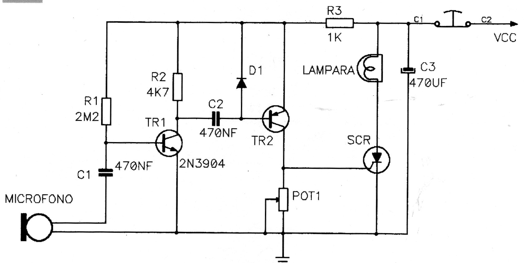 Encontramos este circuito en una antigua documentación europea. El transistor TR1 puede ser BC548 y TR2 puede ser DB136 o incluso BC558. La lámpara puede ser de 6 o 12 V dependiendo de la fuente de alimentación para un TIC106 como SCR, la corriente máxima es de 3 A. El micrófono es de cerámica sensible.