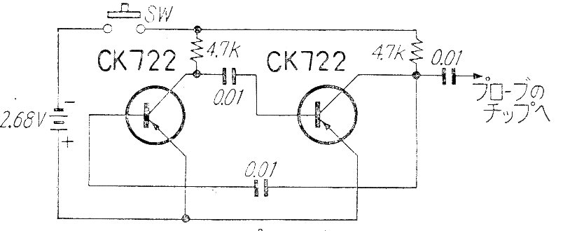 Este circuito es de una publicación de los años 60. Los transistores utilizados son de los primeros tipos comerciales, CK722. El circuito se puede diseñar con transistores modernos y la frecuencia depende del condensador. Con transistores más modernos la alimentación se puede realizar con tensiones de 3 a 12 V.