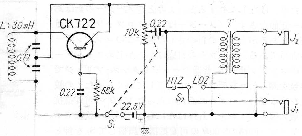 Este oscilador de una publicación antigua utiliza uno de los primeros transistores comerciales, el CK722. Sin embargo, puede equiparse con transistores más modernos. La frecuencia depende de la bobina y los capacitores y el transformador es en caso de que se desee una salida de baja impedancia. La alimentación es proporcionada por una batería de 22,5 V.