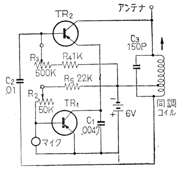 Este pequeño transmisor AM se encontró en una publicación japonesa de la década de 1960. La bobina tiene 20 + 80 vueltas de cable 28 a 32 en un tubo dentro del cual se puede colocar un núcleo de ferrita.