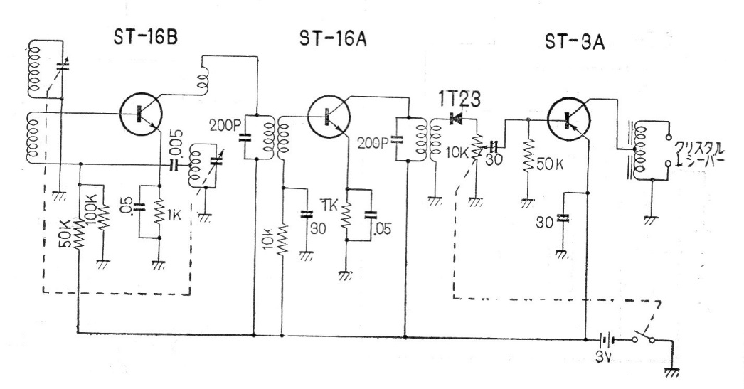 Este es el diagrama de una radio comercial japonesa de la década de 1960. El circuito utiliza transistores de germanio y funciona con dos baterías. No se dan detalles de las bobinas y la escucha se realiza en un teléfono de cristal.