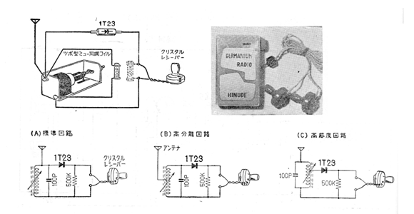 Esta radio de cristal o versión moderna de la radio galena de diodo germanio (de cualquier tipo) fue encontrada en una revista técnica japonesa de 1967. El circuito requiere el uso de un teléfono de cristal o cerámica y una antena larga es importante para escuchar bien. La bobina puede tener de 80 a 100 vueltas de cable 28 a 32 en una varilla de ferrita.