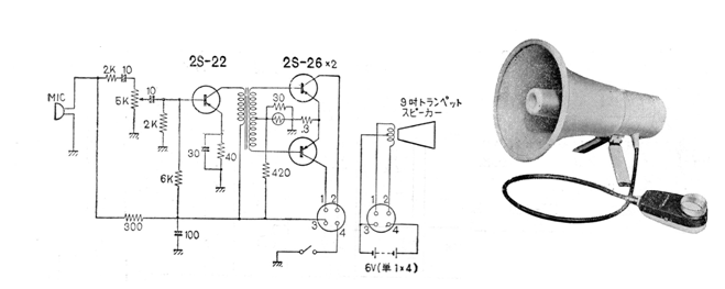 Este es el circuito del megáfono comercial japonés de los años 60 modelo DM-218. El circuito utiliza un altavoz de compresión (bocina) y funciona con 4 baterías grandes. La potencia es de 2 W.