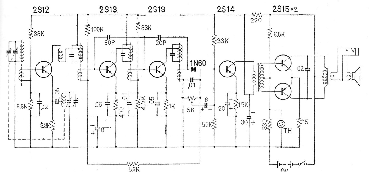 El circuito que se muestra es una radio AM para el rango de onda media japonesa de la década de 1960. El circuito tiene una configuración superheterodina tradicional con una potencia de salida de 80mW. La alimentación se realiza con una tensión de 9 V. El FI es de 455 kHz.
