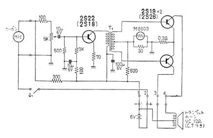 Encontramos este circuito a partir de un megáfono comercial en una publicación japonesa en 1967. El circuito funciona con baterías grandes o batería y usa un altavoz tipo bocina de compresión para un mayor rendimiento. El micrófono es de carbón.