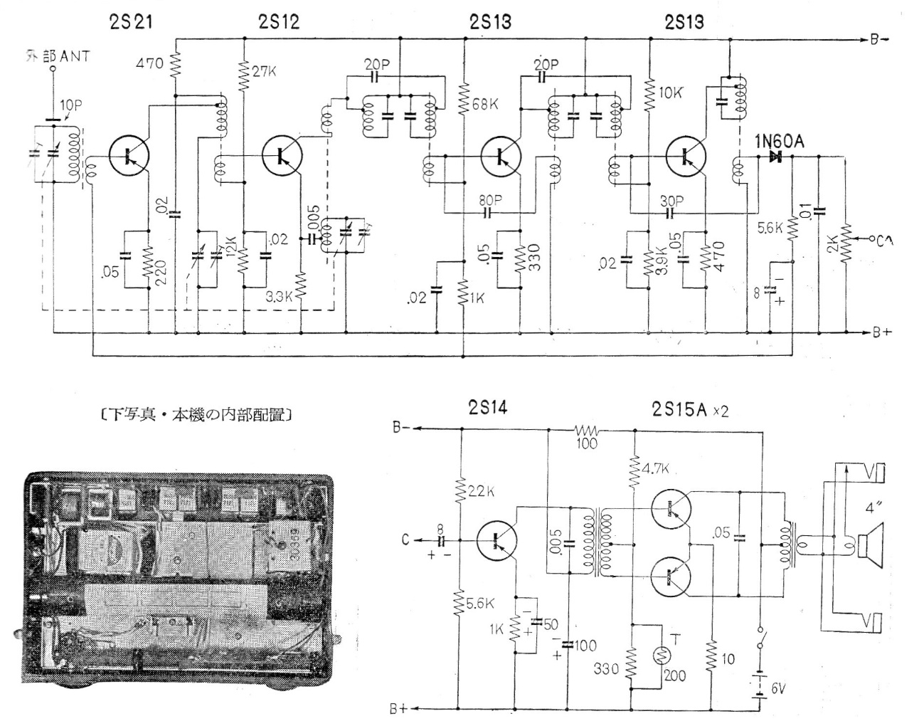 Se trata de una radio comercial japonesa de los años 60. El circuito superheterodino de 7 transistores para ondas medias tiene 200mW de salida cuando funciona con 4 baterías comunes.