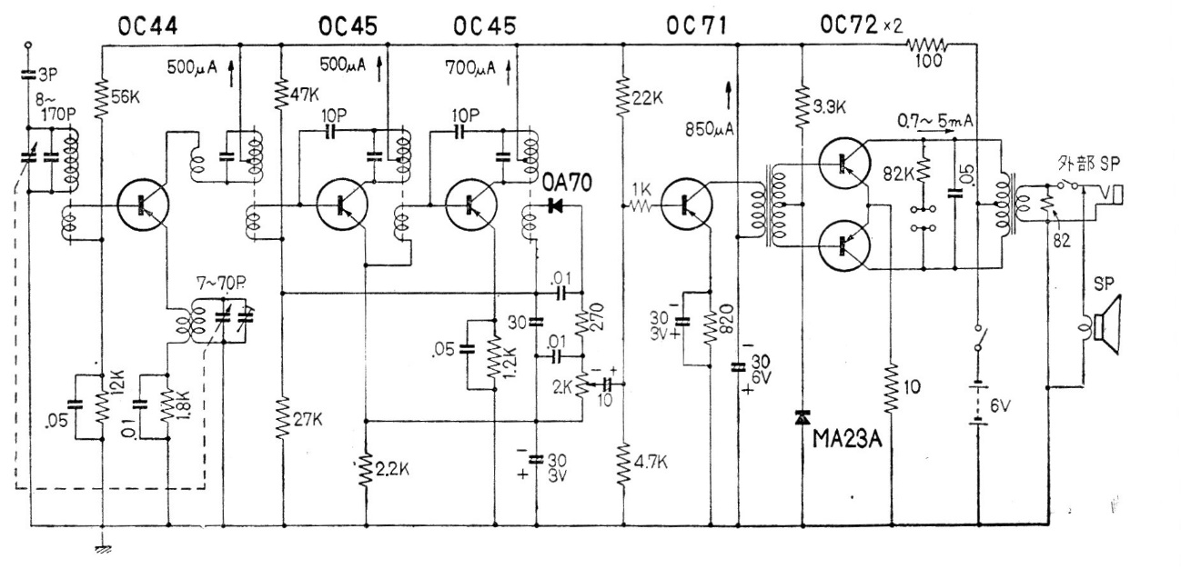 Esta radio comercial de 6 transistores con fuente de alimentación de 6 V se encontró en una publicación japonesa de la década de 1960. El circuito es un superheterodino comercial con 150mW a 200mW de salida a batería.