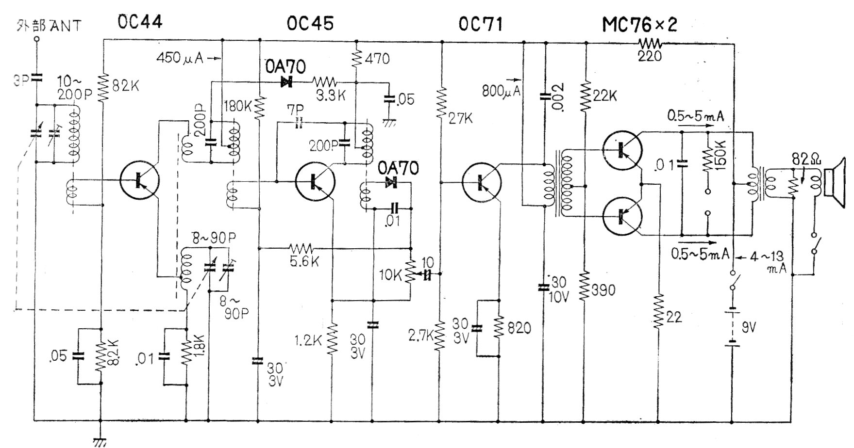 El circuito presentado es una radio comercial japonesa para AM con 50mW de potencia de salida, alimentada por 9 V. El circuito es de los años 60, habiéndose encontrado en documentación de la época.