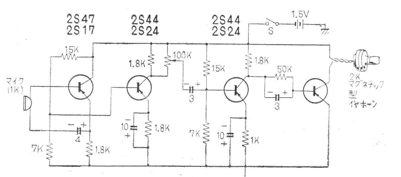Este circuito de muy alta ganancia tiene un auricular de cristal y un micrófono de cerámica o cristal. La ganancia es alta y el control de volumen consta de un potenciómetro. El circuito usa transistores de germanio de la época, como es de una publicación japonesa de 1967.
