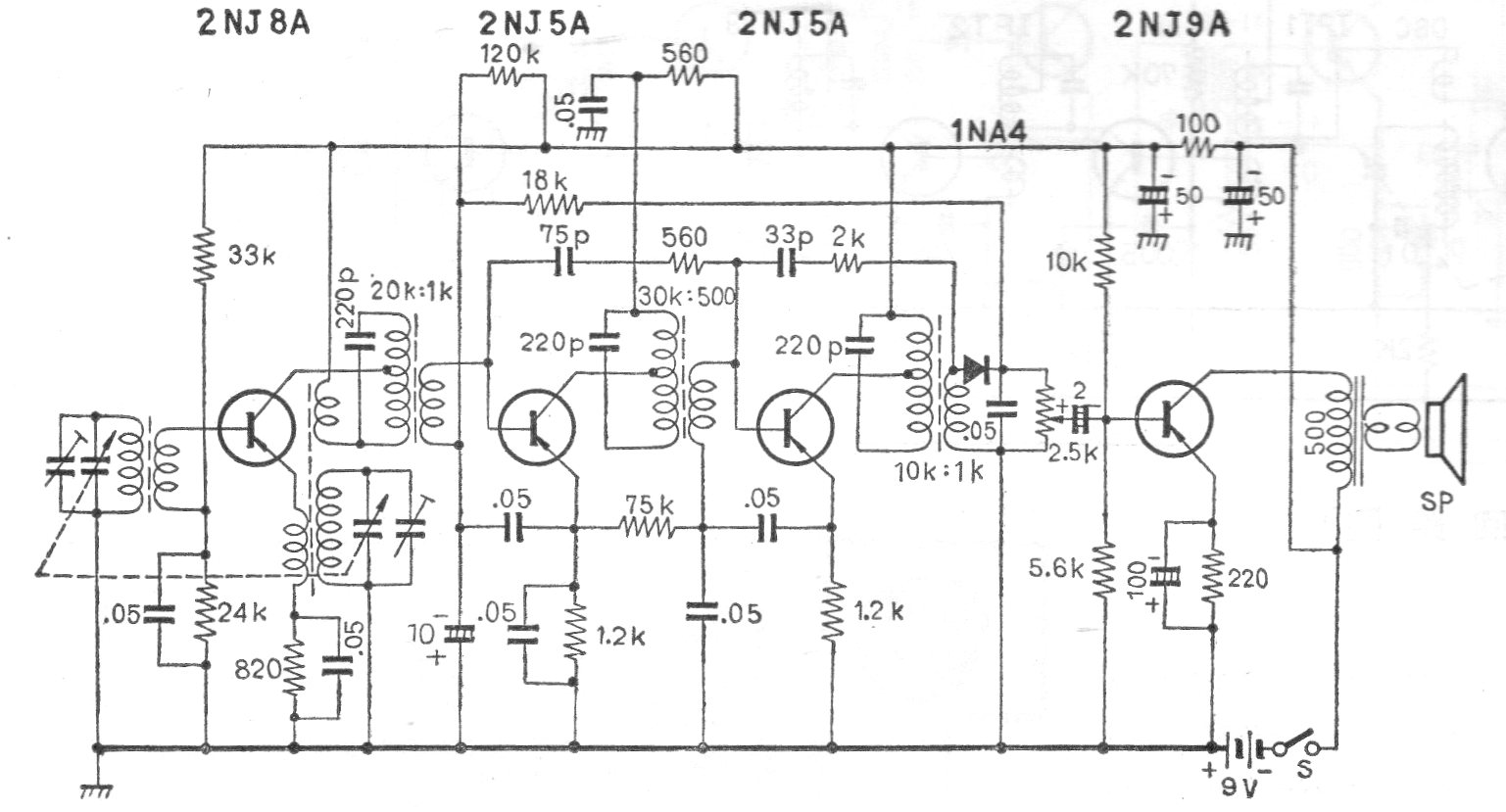 Este es un circuito de radio comercial para la mañana de 1967. Se encontró en documentación japonesa. Los componentes críticos son las bobinas y los transformadores, además de los transistores de germanio que ya no se fabrican en la actualidad.