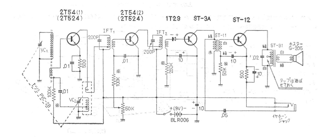Se trata de un circuito comercial para una radio AM con 4 transistores, publicado en una revista japonesa en 1967. Los transistores son de esa época y tanto las bobinas como los transformadores son comerciales, difíciles de conseguir en la actualidad.