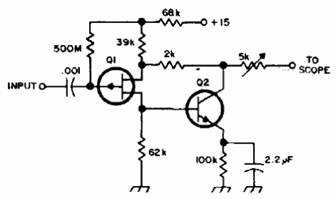 Esta punta de prueba de 1 200 Megohms para instrumentación fue obtenida en una publicación de 1974. El FET puede ser el BF245 o MPF102 y el transistor bipolar puede ser el 2N2222.
