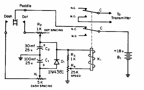 Este circuito genera pulsos de diferentes tiempos para puntos y trazos, accionando un relé. Encontramos esta configuración en una publicación para radioaficionados de 1971. El relé debe tener tensiones de 18 V que es la usada en la alimentación. El circuito se puede cambiar para operar con 12 V.