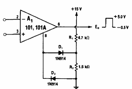 Este circuito limita las señales de entrada a 5 V. El circuito se obtuvo en una publicación de 1974 y amplificadores operacionales más modernos se pueden utilizar como el 751. El circuito debe ser alimentado por una fuente simétrica.