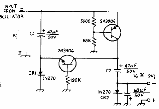 Este circuito se obtuvo en una documentación antigua. Los transistores pueden ser los BC558 y BC548. La frecuencia de conmutación depende de un oscilador externo.