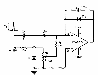 Este circuito fue encontrado en una documentación de 1978. El amplificador operacional es el 741 que debe tener alimentación simétrica. El circuito convierte la intensidad del pulso en una salida de tiempo correspondiente que depende de R y C1.