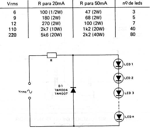 Los LEDs no pueden quedar sometidos a tensiones inversas de más de 5V. El Circuito dado permite su alimentación en C.A. Los valores de R son función del número de LEDs que multiplican por 1,8 debe dar por resultado un valor menor que la tensión de alimentación de la corriente circulante. La tabla es la siguiente: